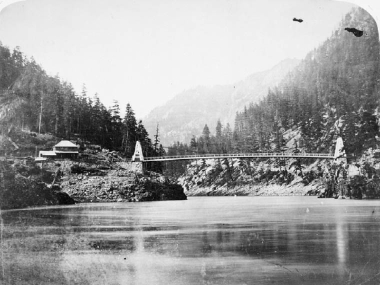 Alexandra Suspension Bridger over Fraser Rivern the Fraser River, 14 miles above Yale. C-088889, Charles Gentile, 1864-67
