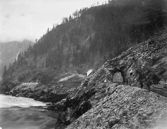 Canadian Pacific Railway construction between Yale and Boston Bar, B.C. Tunnel No. 4, 2 miles above Yale, looking down valley. LAC PA-022531, Richard Maynard, 1881