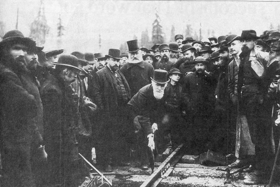Donald A. Smith driving the last spike to complete the Canadian Pacific Railway, Lac C-003693, Alexander Ross, 7 November 1885