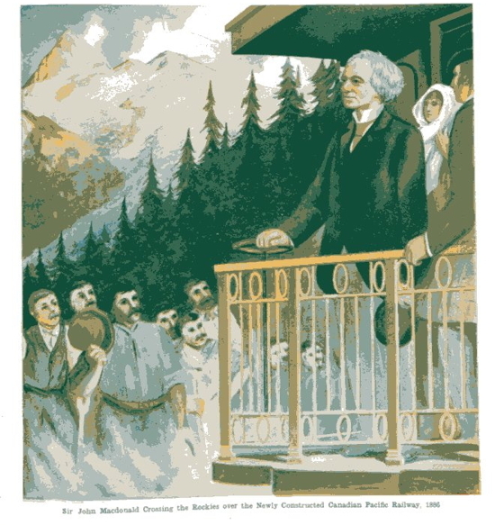 Sir John A. Macdonald Crossing the Rockies Over the Newly Constructed Canadian Pacific Railway, 1886, The Western Home Monthly, Winnipeg, July 1917