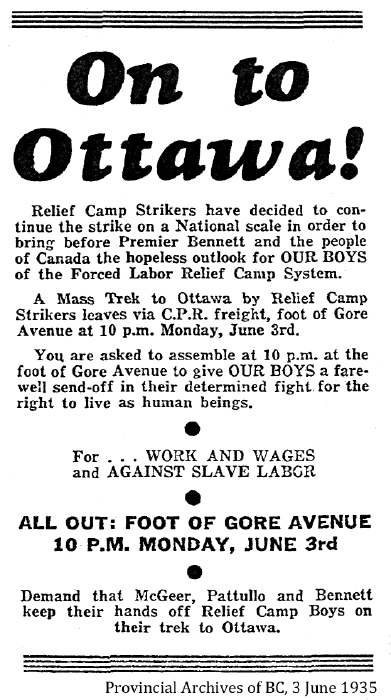 Strikers from unemployment relief camps en route to Eastern Canada during "March on Ottawa". Grévistes de camps d'assistance-chômage en route vers Ottawa durant la " March on Ottawa ". LAC C-029399, June 1935