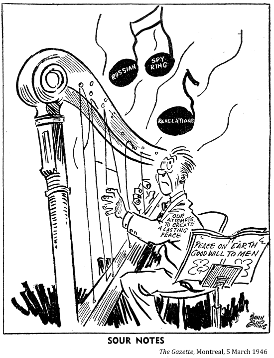 "This is Drew Pearson with a flash from Washington. Canada's Prime Minister Mackenzie King has informed President Truman of a very serious situation affecting our relations with Russia. A Soviet agent [Igor Gouzenko] surrendered some time ago to Canadian authorities and confessed to a gigantic Russian espionage network inside the United States."