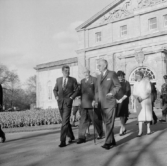 May 1961 Visit of the President of United States John F. Kennedy and his wife Jacqueline. Group in front of the Government House: President John F. Kennedy, Governor General Georges Vanier, Prime Minister John G. Diefenbaker, Mrs. Kennedy, and Mrs. Diefenbaker. LAC, PA-154665, Duncan Cameron May 1961