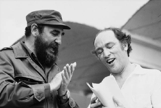 1976 Cuban Prime Minister Fidel Castro and Prime Minister Pierre Elliott Trudeau join in a singalong during the P.M.'s Latin American Tour. LAC, PA-136976, Duncan Cameron January 1976