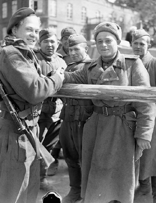 Unidentified Forward Observation Officer of the Royal Canadian Artillery (R.C.A.) shaking hands with a Russian soldier, Wismar, Germany, 4 May 1945. Lieut. Charles H. Richer / Canada. Dept. of National Defence / LAC / PA-150930
