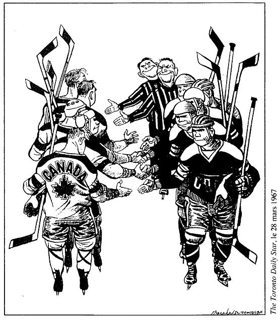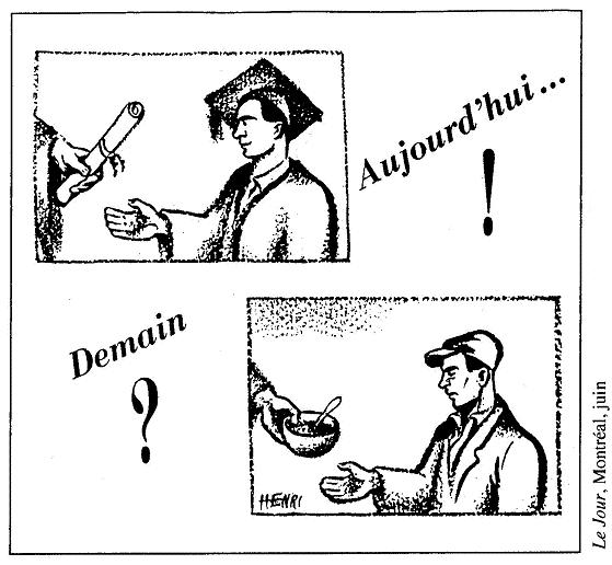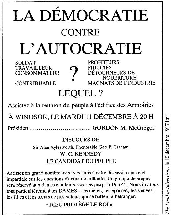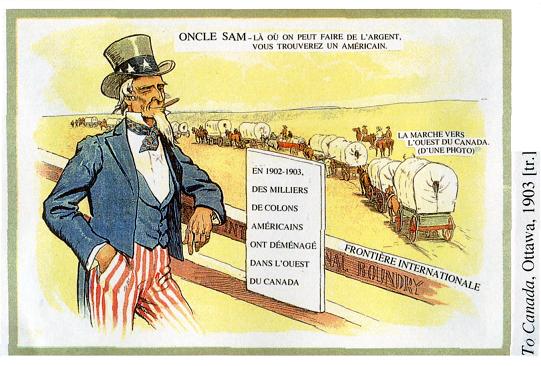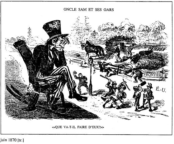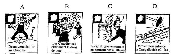 l'histoire canadienne, 2006 © The Begbie Contest Society Section I Questions à choix multiples (Temps de réponse suggéré : 25 minutes; proportion de la note : 25 %) Chaque question est suivie de quatre réponses possibles identifiées par A, B, C et D. Choisis la réponse qui te paraît la meilleure et inscris-la dans la section I du livret de réponses. ![]() Les gardes du corps de la Britannia Canadian Courier, Toronto, le 3 avril 1909 [tr] 1. Cette illustration est en faveur : A De l'internationalisme B De la défense impériale C Du développement impérial D De l'indépendance coloniale ![]() Juin 1870 [tr] 2. Cette caricature traite des Fenians, un groupe d'Américains-Irlandais qui cherchait à nuire à la Grande-Bretagne en attaquant le Canada à partir de bases situées aux États-Unis. La caricature est probablement parue dans un journal publié par : A Des Irlandais B Des Fenians C Des Américains D Des Canadiens ![]() Frank Leslie's Illustrated Newspaper, New York, le 28 novembre 1885, SAB 3. Le 28 novembre 1885, les Montréalais ont brûlé l'effigie de Sir John A MacDonald au socle de la reine Victoria. Quel événement a provoqué cette action? A Le scandale du Pacifique B La politique nationale C L'exécution de Louis Riel D La réalisation du chemin de fer Canadian Pacific ![]() Grip, Toronto, le 4 février 1888 [tr] PROTECTION UNILATÉRALE EXPOSITION DES RÉSULTATS DU PROCESSUS D'ENGRAISSEMENT ARTIFICIEL AU CANADA, APRÈS NEUF ANS D'EXPÉRIENCE 4. Cette caricature critique : A Le libre-échange B La gloutonnerie C Le capitalisme D Le tarif de protection ![]() National Home Monthly, Winnipeg, novembre 1935, PAM [tr] 5. Quel est le thème prédominant de cette illustration? A Le changement B Le progrès C Le mouvement D Les transports ![]() To Canada, Ottawa, 1903 6. Quel énoncé résumerait le mieux cette caricature? A Les bonnes clôtures font les bons voisins B Les Américains avaient l'intention de s'emparer de l'ouest du Canada C Le gouvernement américain approuvait l'émigration au Canada D Le gouvernement américain désapprouvait l’émigration au Canada ![]() 7. Quel sous-titre conviendrait le mieux à ce graphique? A Le Canada revient vers la gauche B Le Canada revient vers la droite C Le Canada revient vers le centre D Le Canada s'éloigne du centre ![]() The London Advertiser, le 10 décembre 1917 8. Cette annonce a été conçue pour attirer les adversaires d'un événement. Lequel? A La conscription B Le gouvernement Borden C Le mouvement des suffragettes D La participation du Canada à la guerre 9. « Je veux me débarrasser du problème des Indiens... Notre objectif est de continuer jusqu'à ce qu'il ne reste aucun Indien au Canada n'ayant pas été intégré à la société et qu'il n'y ait plus de problème indien ou de ministère des Affaires indiennes. » Duncan Campbell Scott, surintendant adjoint des Affaires indiennes (1913-1932) Comment se nomme la politique de Scott? A L'assimilation B L'extermination C L'adaptation D Le multiculturalisme ![]() The Halifax Herald, le 5 février 1920 10. Quelle était l'intention du caricaturiste? A S'opposer à la conservation des ressources naturelles B Soutenir la conservation des ressources naturelles C S'opposer à l'exportation des produits forestiers non transformés D Soutenir l'exportation des produits forestiers non transformés ![]() The Grain Grower's Guide, Winnipeg, le 10 septembre 1924 11. Qu'est-ce que cette illustration évoque? A L'impact de la radio sur les communautés rurales B Le besoin de créer des stations de radio publiques C Les problèmes qu'ont les familles à choisir un poste de radio D L'influence de la culture américaine sur les Canadiens ![]() Le Jour, Montréal, [tr] 12. Quelle est la date probable de cette caricature? A 1918 B 1928 C 1938 D 1948 13. Parmi les mesures suivantes, lesquelles incarnent tout particulièrement le nationalisme canadien? 1. L'octroi du droit de vote aux femmes en 1918 2. L'érection d'un monument aux morts sur la crête de Vimy, en France en 1936 3. La création de la Société Radio-Canada en 1936 4. L'achèvement de la route de l'Alaska en 1942 5. La Loi sur les allocations familiales en 1944 A 1 et 2 B 2 et 3 C 3 et 4 D 1 et 5 ![]() The Institute of Public Affairs, Halifax, 1943 14. Quel nom donne-t-on aux changements proposés en 1943 par le rapport Marsh à la société canadienne? A Le régime d'assurance-maladie B Le communisme C Le crédit social D La sécurité sociale 15. « Cette politique incarne la meilleure tradition du Parti libéral. Elle est le plus récent lien dans une longue série d'événements qui, selon les principes établis par les anciens artisans de la réforme, MM Baldwin et Lafontaine, ont amené, petit à petit et étape par étape, le Canada à la position qu'il occupe maintenant, soit le rang, la dignité et le prestige d'une nation au sein de l'Empire britannique. » Sir Wilfrid Laurier, Débats de la Chambre des communes, le 3 février 1910 Quelle décision Wilfrid Laurier est-il en train de défendre? A Créer une marine canadienne et recruter des hommes B Donner de l'argent à la Grande-Bretagne pour accroître la Marine royale C Construire des navires de guerre, leur donner un équipage et en laisser le contrôle à la Grande-Bretagne D Construire des navires de guerre, leur donner un équipage, et en donner le contrôle au Canada en temps de paix et à la Grande-Bretagne en temps de guerre ![]() Pacific Advocate, Vancouver, le 12 avril 1946 16. Quel est le phénomène illustré dans ce tableau? A L'inflation B La déflation C L'augmentation du niveau de vie D Un plus grand pouvoir d'achat aux consommateurs ![]() Ford Facts, Detroit, le 2 octobre 1947 17. Qui aurait probablement publié le journal dans lequel cette caricature est apparue? A Un syndicat B Le gouvernement C Le Parti conservateur D La Compagnie Ford Limitée ![]() La Réforme, Montréal, 20 au 27 octobre 1962 [tr] 18. Quel était le but du sloga