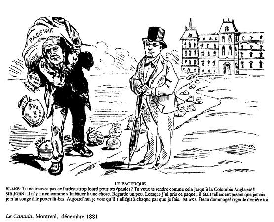 l’opposition libérale, Edward Blake, à droite. Cette caricature : A.