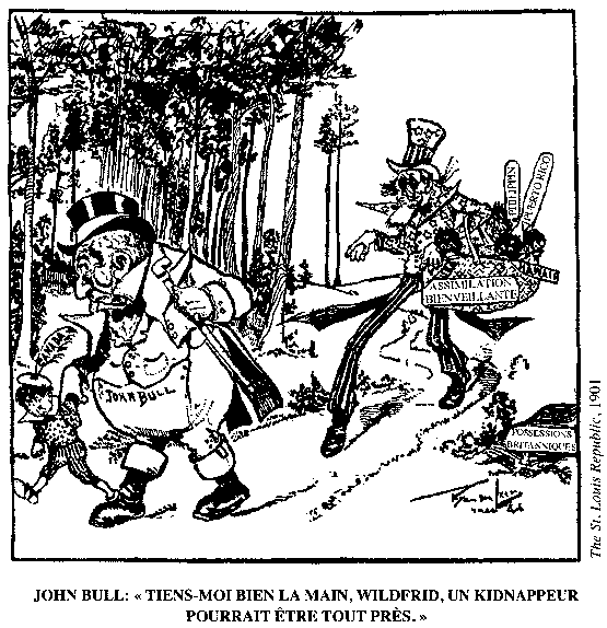(de Grande-Bretagne, en arrière-plan) se trouve entre Oncle Sam (à g.) et