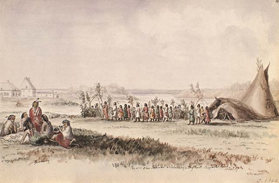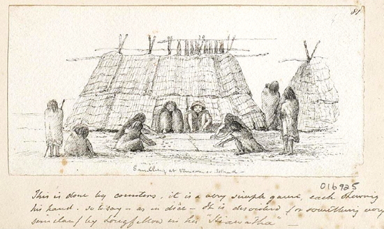 Gambling and Cree Indians celebrating a Dog Feast. Rupert's Land 13 Sept. '57. Jeu et Indiens cris à un festin de chien. Terre de Rupert, 13 septembre 1857. George Seton, LAC Acc. No. 1950-63-1.9R, 17 April 1862