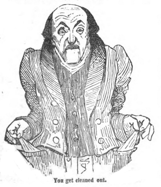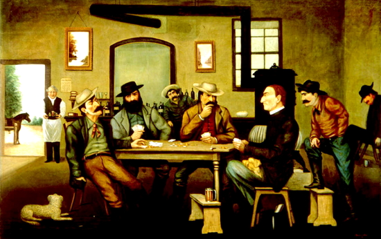 "Slim Jim a noted gambler is represented in the painting, in the garb of a parson, one of his favourite disguises. With his usual good luck he takes the pot."