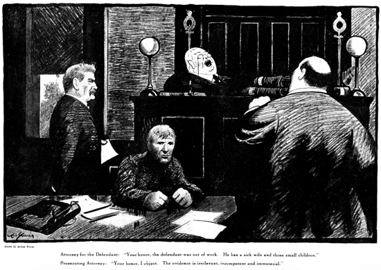 Attorney for the Defendant: "Your honor, the defendant was out of work. He has a sick wife and three small children."