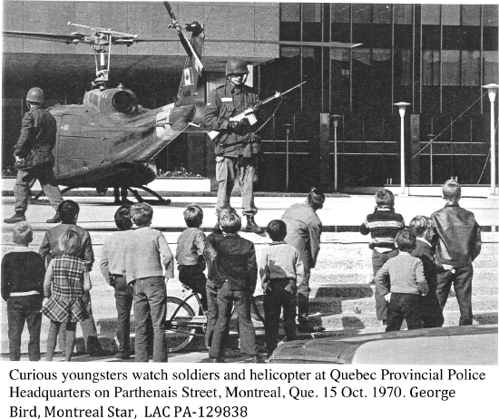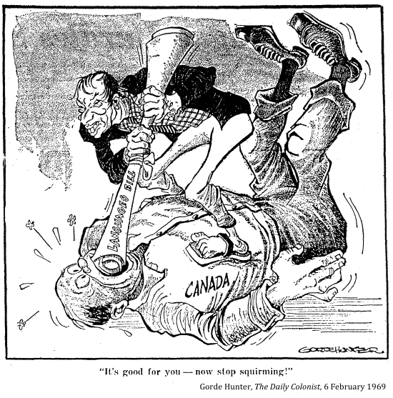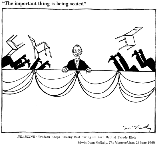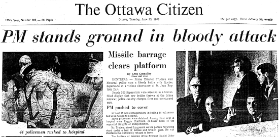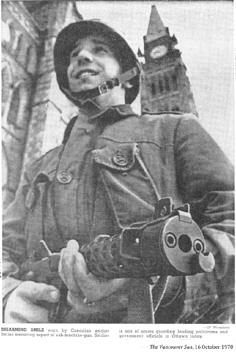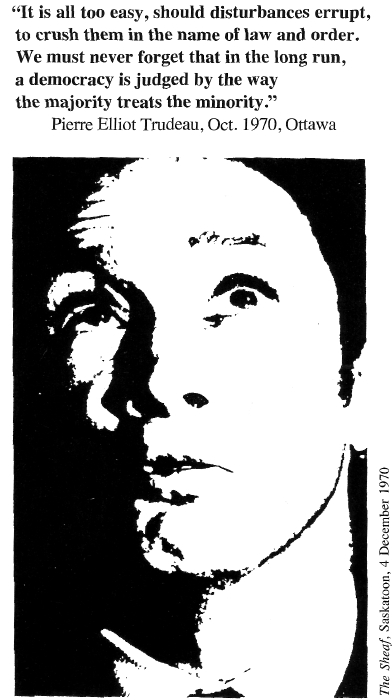 Trudeau: "Yes, well there are a lot of bleeding hearts around who just don't like to see people with helmets and guns. All I can say is, go on and bleed, but it is more important to keep law and order in the society than to be worried about weak-kneed people who don't like the looks of..."