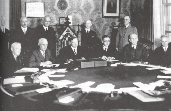 Albert Premier Brownlee and Prime Minister King sign an agreement giving Alberta juridisction over crown lands and natural resources, 14 December 1929, Public domain, via Wikipedia Commons