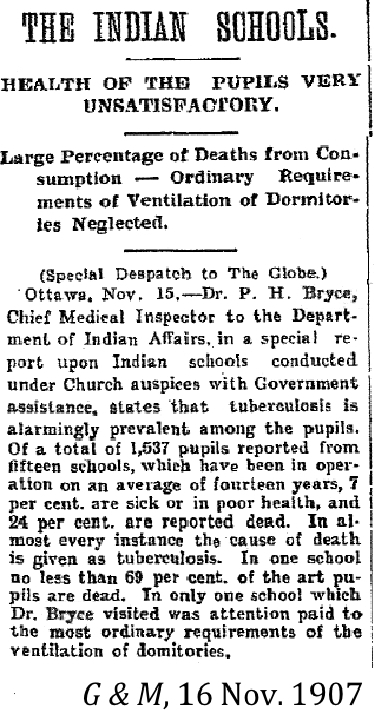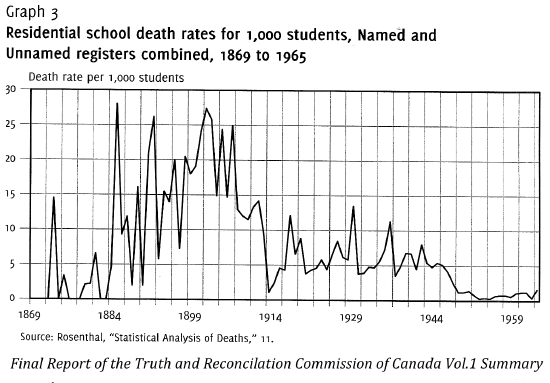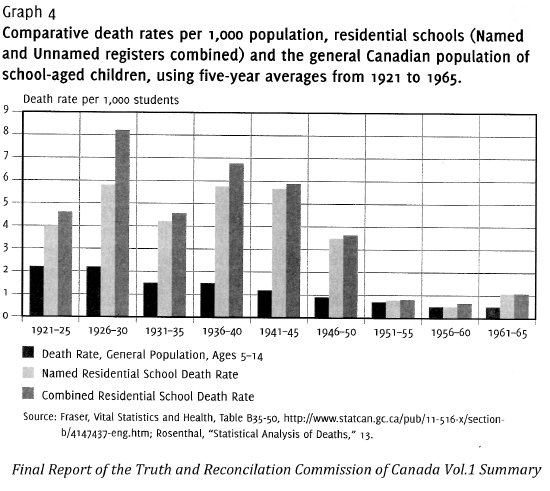 "The government was well aware of the extreme death rates associated with rampant spread of tuberculosis in the institutions as they own study, conducted by Dr. Peter Henderson Bryce, confirmed and condemned the deplorable conditions and the resulting death rates. Nonetheless, Canada refused to make the necessary changes to stem the tide of tuberculosis infection, knowing full well the children were dying at rates as high as 50 per cent in some schools."