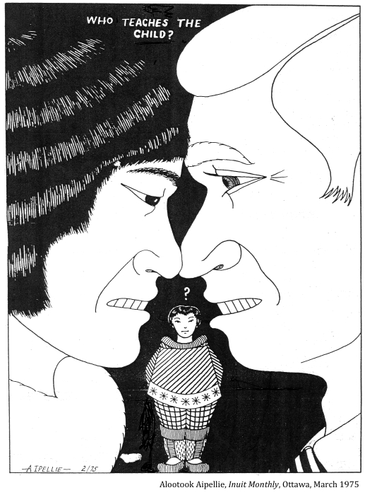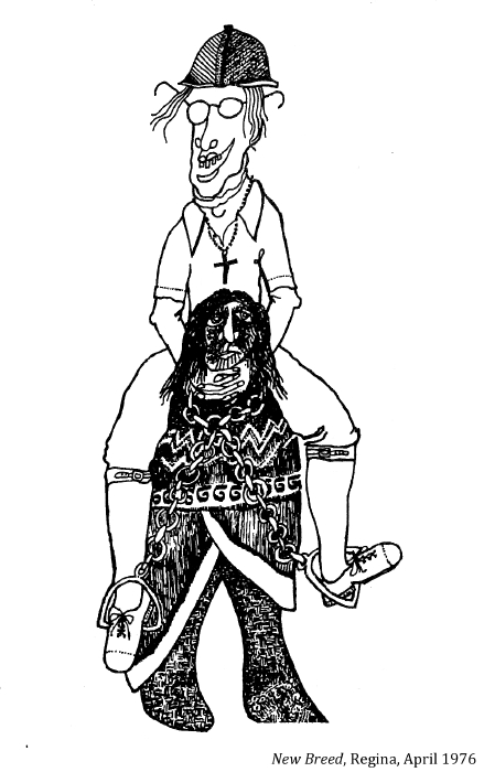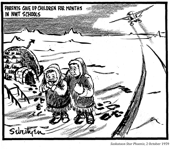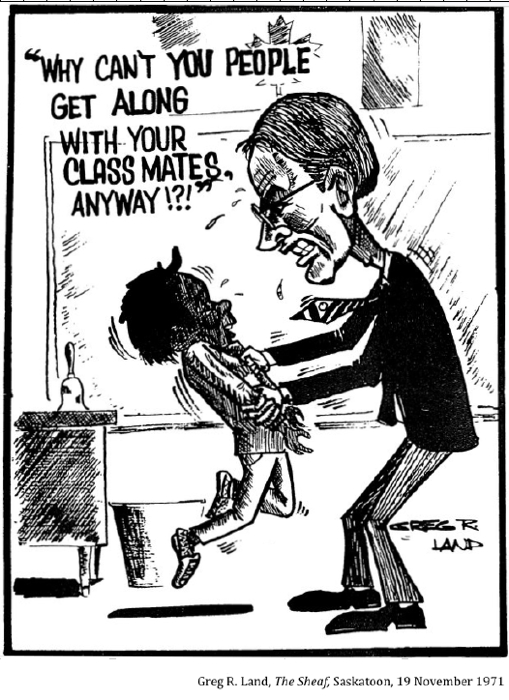 [A cartoon used to illustrate an article about the Shubenacadie Indian Residential School in Nova Scotia. The article uncovered evidence of physical and sexual abuse, meager food and cultural genocide in an institution run like a prison.]