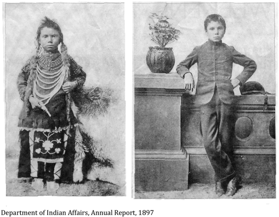 “When the school is on the reserve, the child lives with its parents, who are savages, and though he may learn to read and write, his habits and training mode of thought are Indian. He is simply a savage who can read and write. It has been strongly impressed upon myself, as head of the Department, that Indian children should be withdrawn as much as possible from the parental influence, and the only way to do that would be to put them in central training industrial schools where they will acquire the habits and modes of thought of white men."