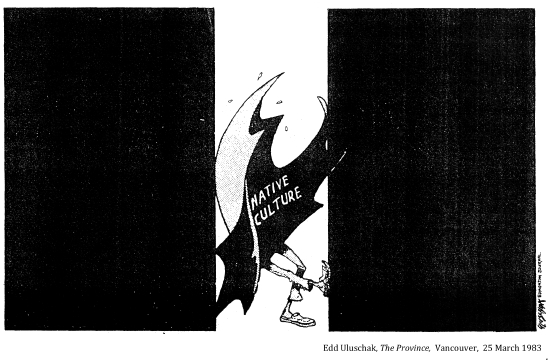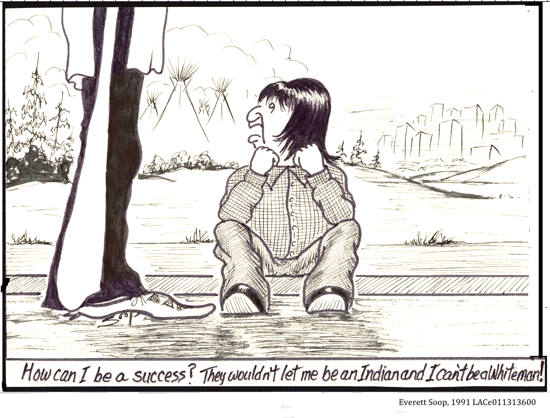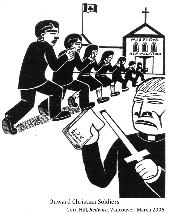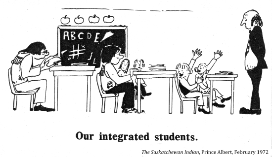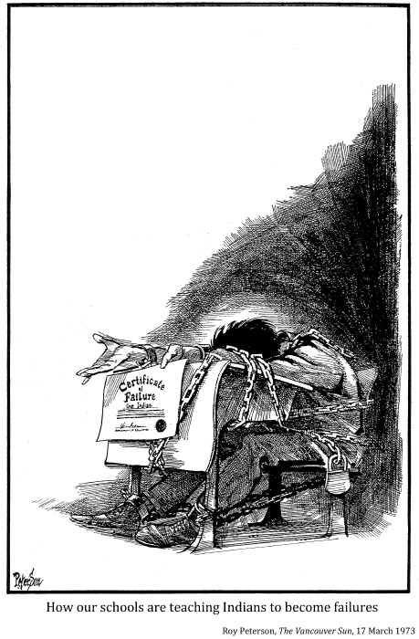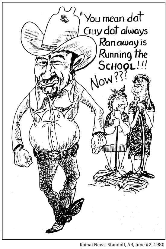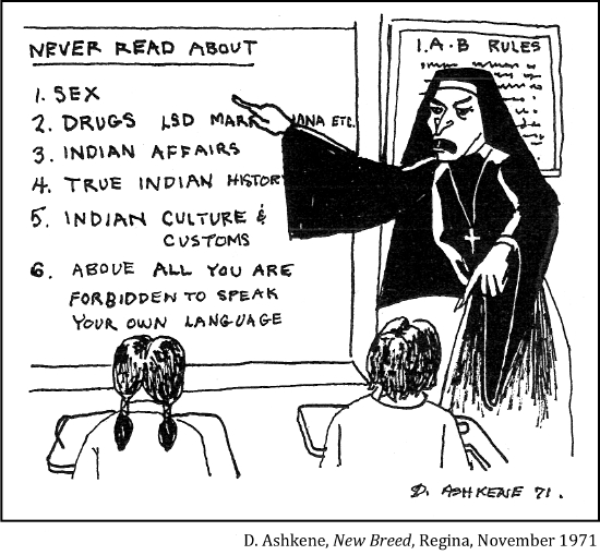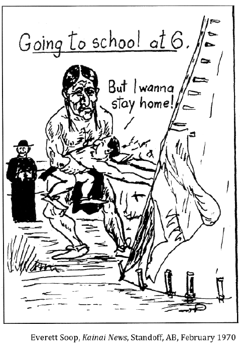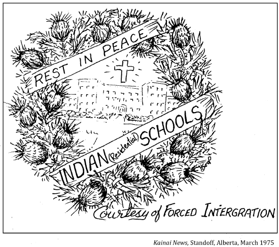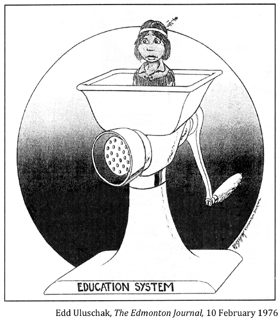 "That education consisted of nothing that had any relationship to our homes and culture. Indeed Stoney culture was condemned explicitly and implicity. Our classes consisted of teachings in Protestant religion and ethics, the three Rs and European and Church history. From listening to these teachings it seemed to me that the only good people on earth were non-Indians and specifically white Christians. We were taught that the work and knowledge of our medicine men and women were of the Devil. We were taught that when people died they went to Heaven and walked streets paved with gold or to Hell and forever roasted in a lake of fire."
