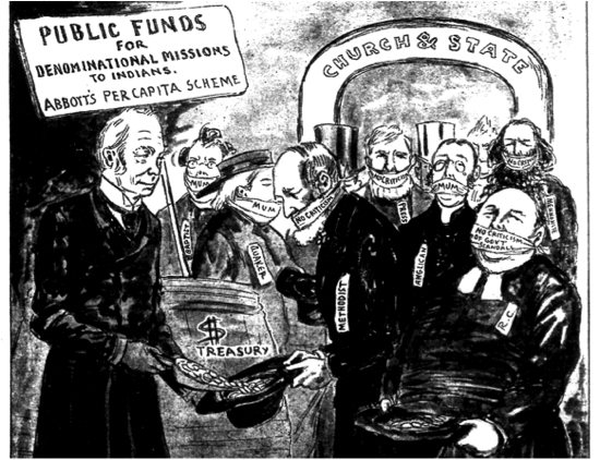 [PUBLIC FUNDS FOR DENOMINATIONAL MISSIONS TO INDIANS. ABBOTT'S PER CAPITA SCHEME. CHURCH & STATE, Mum, Mum, No Criticism , No Criticism of Gov't Scandals, Mum, No Criticism. Baptist, Quaker, Methodist, Anglican, Roman Catholic, Mennonite, $ Treasury, Canada's Barrel].