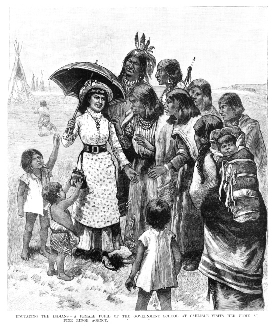 EDUCATING THE INDIANS – A FEMALE PUPIL OF THE GOVERNMENT SCHOOL AT CARLISLE VISITS HER HOME AT PINE RIDGE AGENCY.