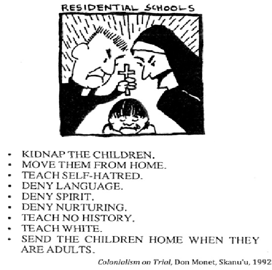 "How could citizen from 'the true north strong and free' possibly allow prime minister after prime minister (and don't forget the pope), to oversee the perpetuation of this systematic cultural genocide on thousands of Native kids? It was a national crime, a human rights violation, and government cover-up at the highest level. . . I take a very personal interest in how the Canadian and American governments legalized the tormenting, abuse, and killing of Native children. This legislation caused intergenerational grief, alcoholism, hatred, mistrust, and community and family breakdown in Native communities across the continent, which persists to this day. . . I run out of fingers when I count my family members and close relatives who became alcoholics, committed suicide, or have done serious jail time. What kind of a people, what kind of a country, could allow this?"