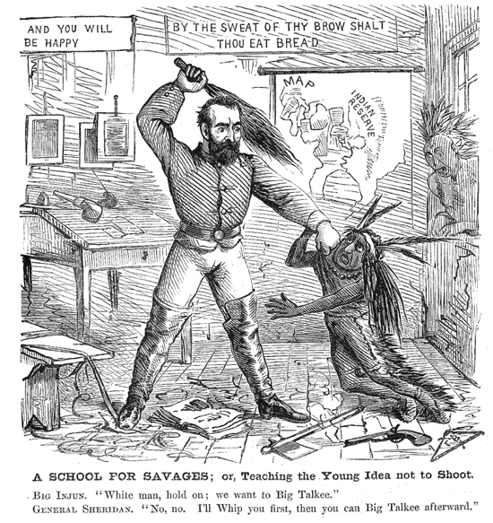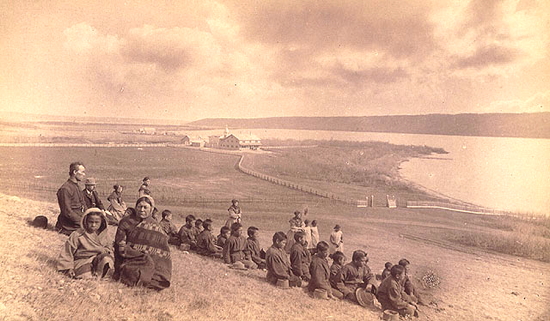[The Carlisle Indian Industrial School in the United States opened in 1879 and operated for nearly 30 years with a mission to “kill the Indian” to “save the Man.” This philosophy meant administrators forced students to speak English, wear Anglo-American clothing, and act according to U.S. values and culture. This is the model school copied by Davin.]