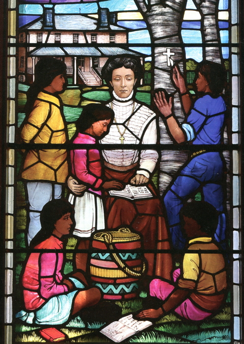 This stained glass window is found in Brantford, Ontario, on Six Nations territory. It was dedicated to Susan Hardie, a part Aboriginal teacher, who had attended the Anglican-run residential school as a child, by former students in 1960. She taught at the school for 50 years and was known as one of the kinder staff members.