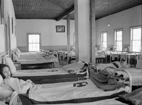 Two Cree girls in their beds in the girls' dormitory at All Saints Indian Residential School, Lac La Ronge, Saskatchewan, March 1945. LAC PA-166582, NFB, Bud Glunz