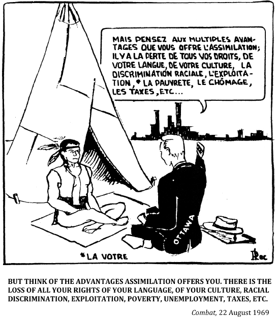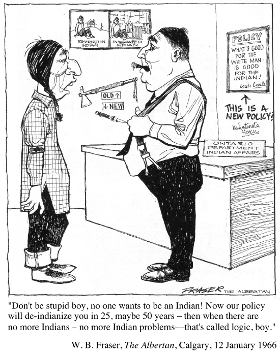 "I want to get rid of the Indian problem. I do not think as a matter of fact, that this country ought to continuously protect a class of people who are able to stand alone. That is my whole point. Our objective is to continue until there is not a single Indian in Canada that has not been absorbed into the body politic, and there is no Indian question, and no Indian Department. . ."