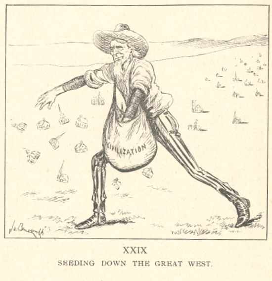 Here is Uncle Sam sowing his great western farm with churches, schools and colleges – the seed that has produced the crop of liberty and civilization.