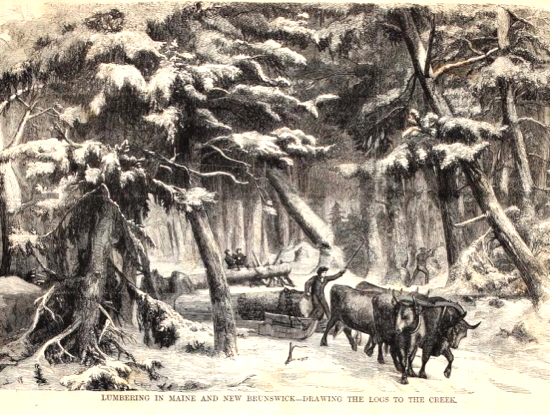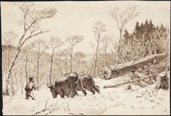 Oxen Dragging a Felled Tree. Boeufs tirant un arbre abattu. LAC, Acc. No. R9266-250 Peter Winkworth Collection of Canadiana, George H. Harvey, ca. 1846-1910