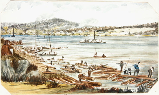 Steam ferry-boat and rafting timber on St. John River near Fredericton, New Brunswick. LAC, Acc. No. 1985-3-70, William S. M. Wolfe, 1854-54