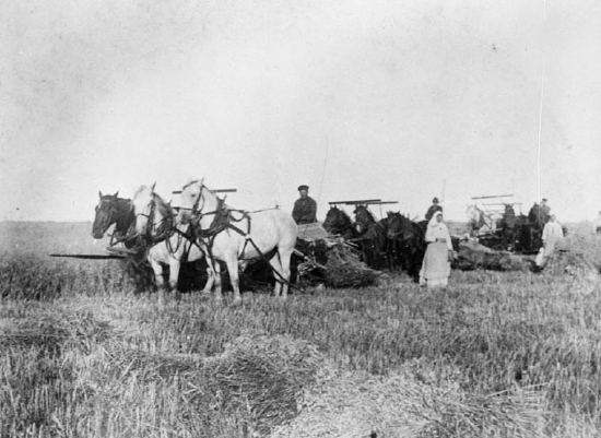 Communal harvesting. The men ride the binders and the women stook. LAC C-009787, 1910-12
