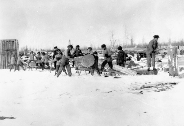 Ukrainian women cutting logs, Athabasca, Alberta. LAC C-019134, 1930