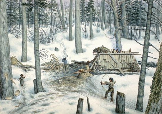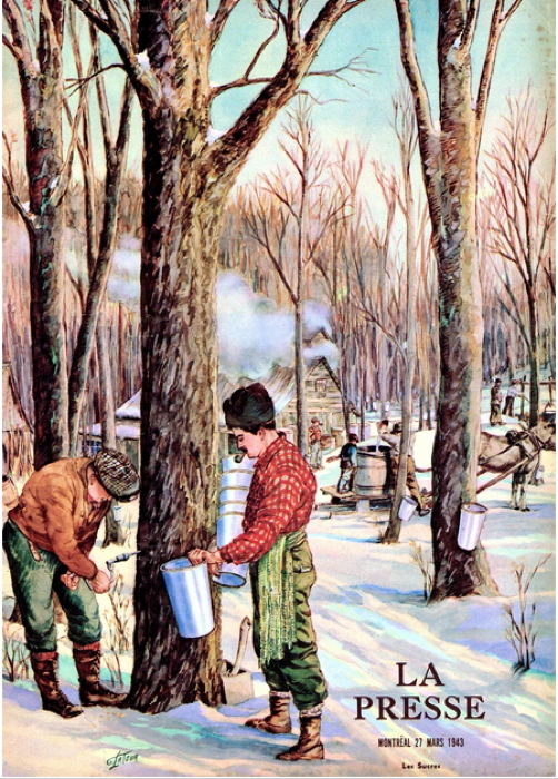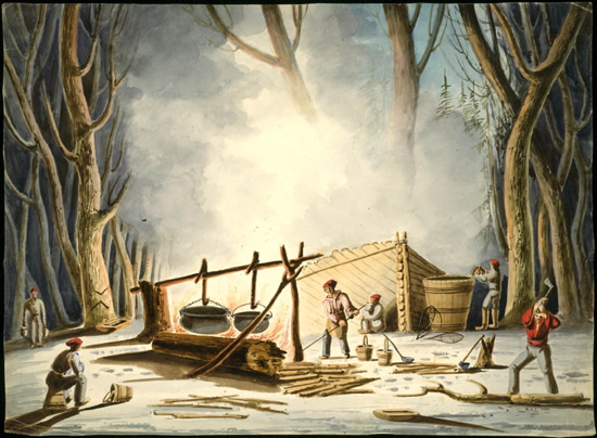 Making Maple Sugar, Lower Canada. Préparation du sucre d'érable, Bas-Canada. LAC Acc. No. 1988-10-3, Philip John Bainbrigge, ca. 1837