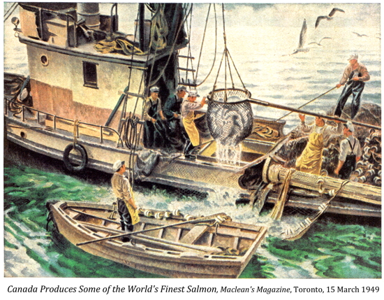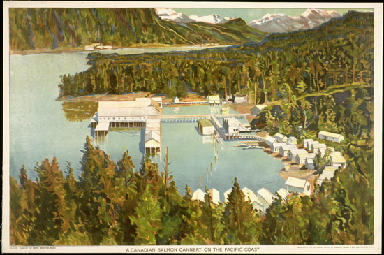 A Canadian Salmon Cannery on the Pacific Coast. Une conserverie de saumon canadien sur la côte du Pacifique, Canada. Great Britain, Empire Marketing Board, LAC Acc. No. 1983-27-363, 1926-1934