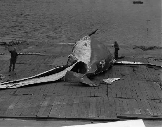 A humpback whale being skinned. Baleine à bosse que l'on dépouille. Photograph taken in British Columbia. NFB Photo Story: Annual Kill 600: Canadian Whaling Fleet. Title based on the following caption from the NFB Photo Story: Towed up seaplane ramp of converted RCAF base at Coal Harbour, a 50-ton Humpback has its skin peeled back, banana-fashion, be "flensing" crew. Using razor-sharp flensing knives, the crew makes three cuts through the blubber from tail to head, parting the firm white coat with a crisp sound. Blubber is then cut into strips and diced before being fed into digesters. Mammals yield big returns in blubber, oil and bone fertilizer. To a limited extent, fast-frozen, beef-like "whale steaks" are sold in Vancouver shops for human consumption. Canada's whaling industry has operated since 1890.Chris Lund, 1948, LAC National Film Board fonds/e011175762
