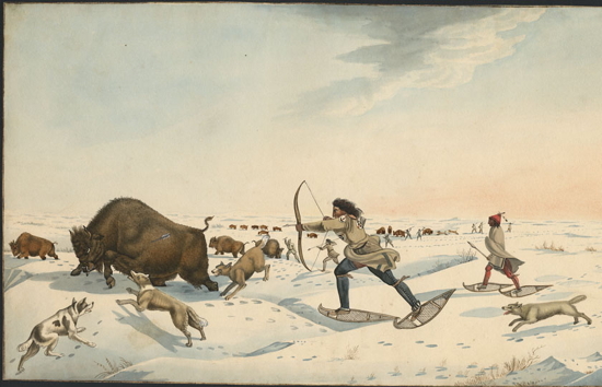Indian Hunters Pursuing the Buffalo in the Early Spring. Chasseurs indiens poursuivant le bison, tôt au printemps. LAC, Acc. No. 1981-55-68 Bushnell Collection, Peter Rindischbacher, ca. 1822