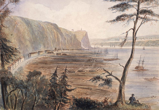 Dépôt de bois près de Québec, vers 1838. Timber depot near Québec, ca. 1838. LAC C-016549, Willliam Henry Bartlett