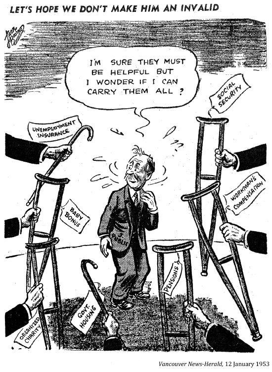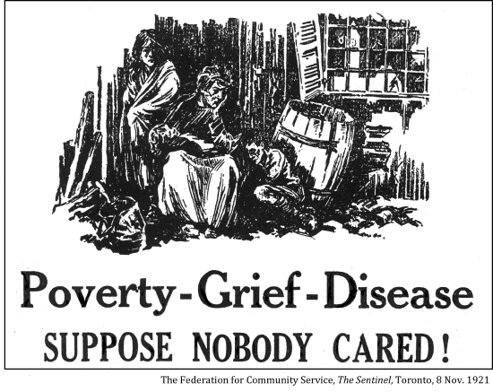 "Until the twentieth century state-supported social welfare programs were virtually non-existent. In the largely rural Canada of the nineteenth century help for the poor, sick and aging member of the community was provided by the family and by local religious and charitable organizations. Increasing urbanization and industrialization did little to change the prevailing view among Canadians that those who needed financial assistance and health-care services were the responsibility of relatives and friends rather than the state . . . [however eventually] urban environment families and charitable institutions were unable to provide sufficient funds and services. The state was called in to fill the gap."